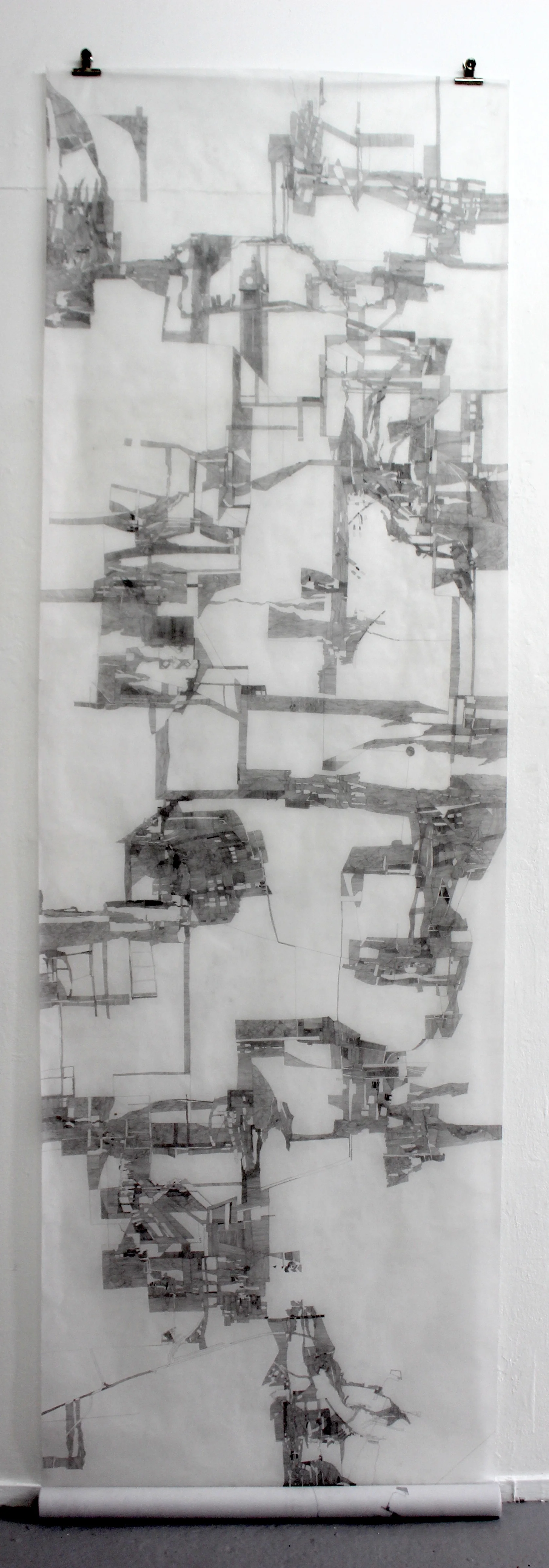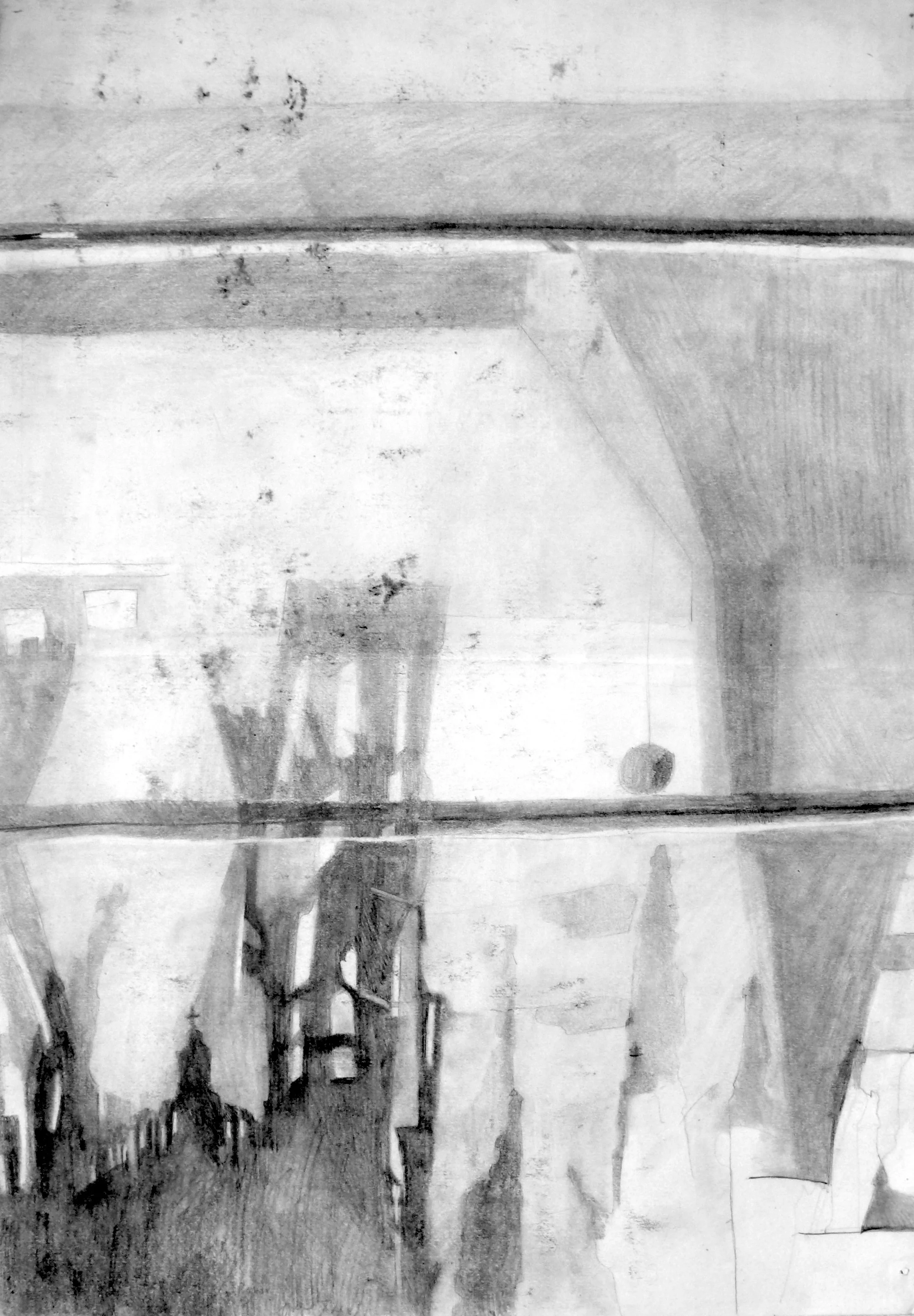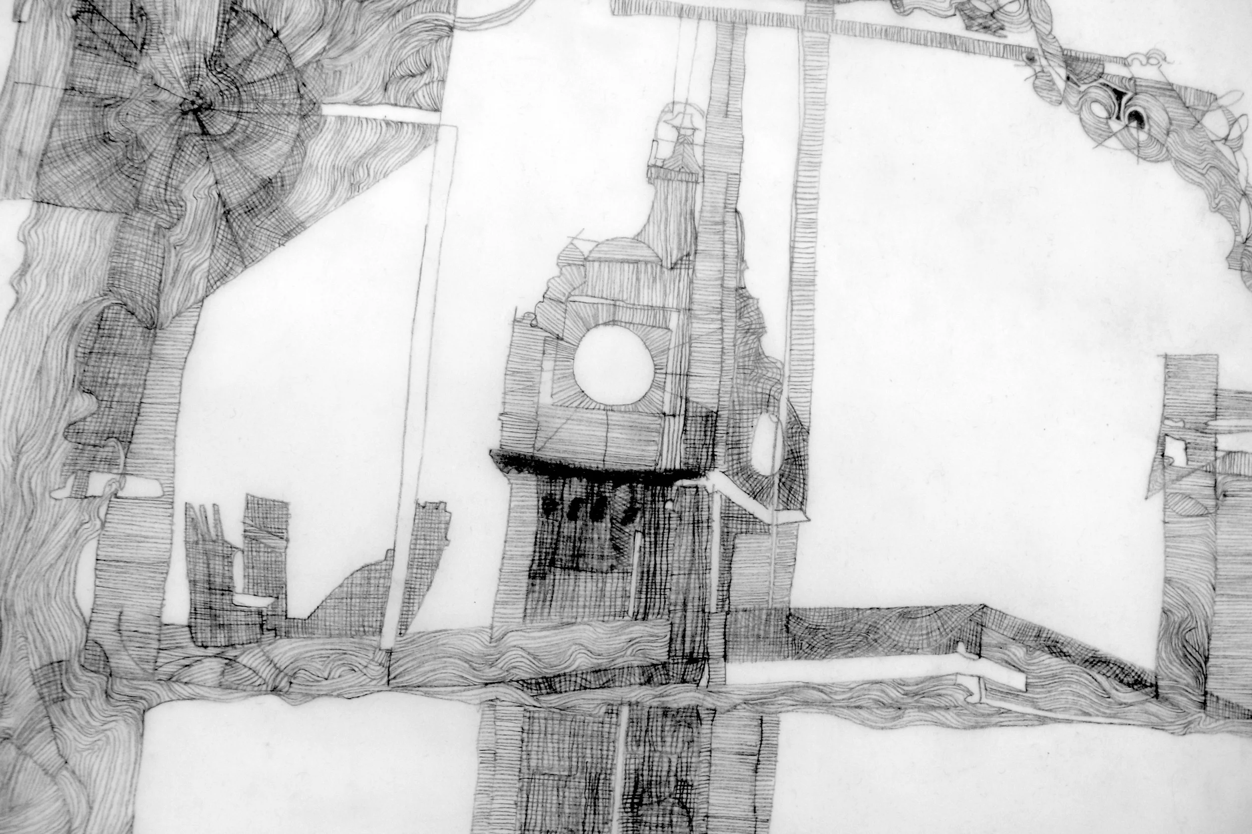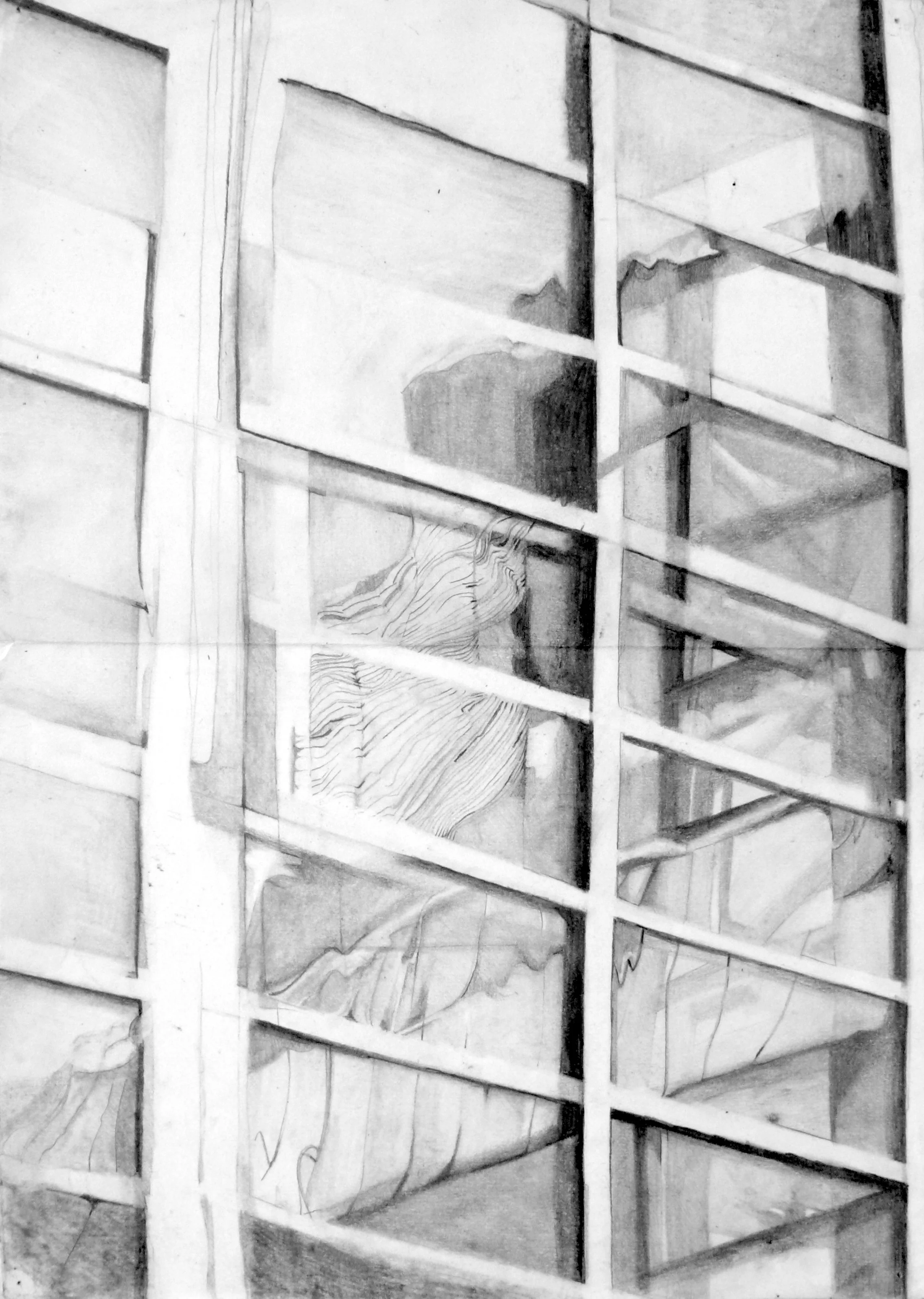 These drawings suggest imaginary worlds constructed from observational drawings of familiar scenery, as altered by the visual language of reflection - shifting, distortion and repetition. They play with interactions between the 'real' and 'unreal' worlds - surface vs. reflection, architecture vs. planning, geography vs. map - to represent the experience of the city as a place of density and disorientation.
